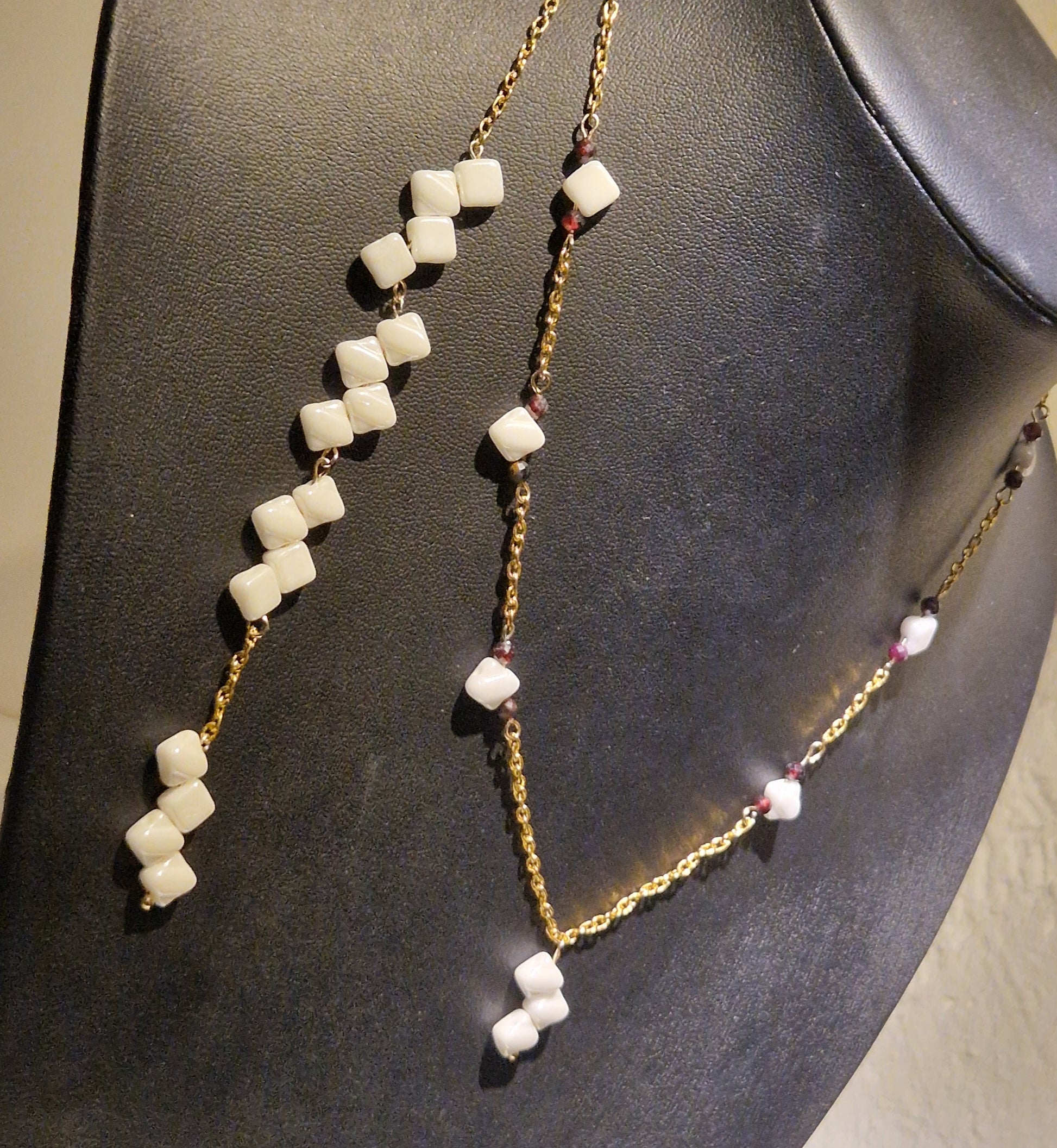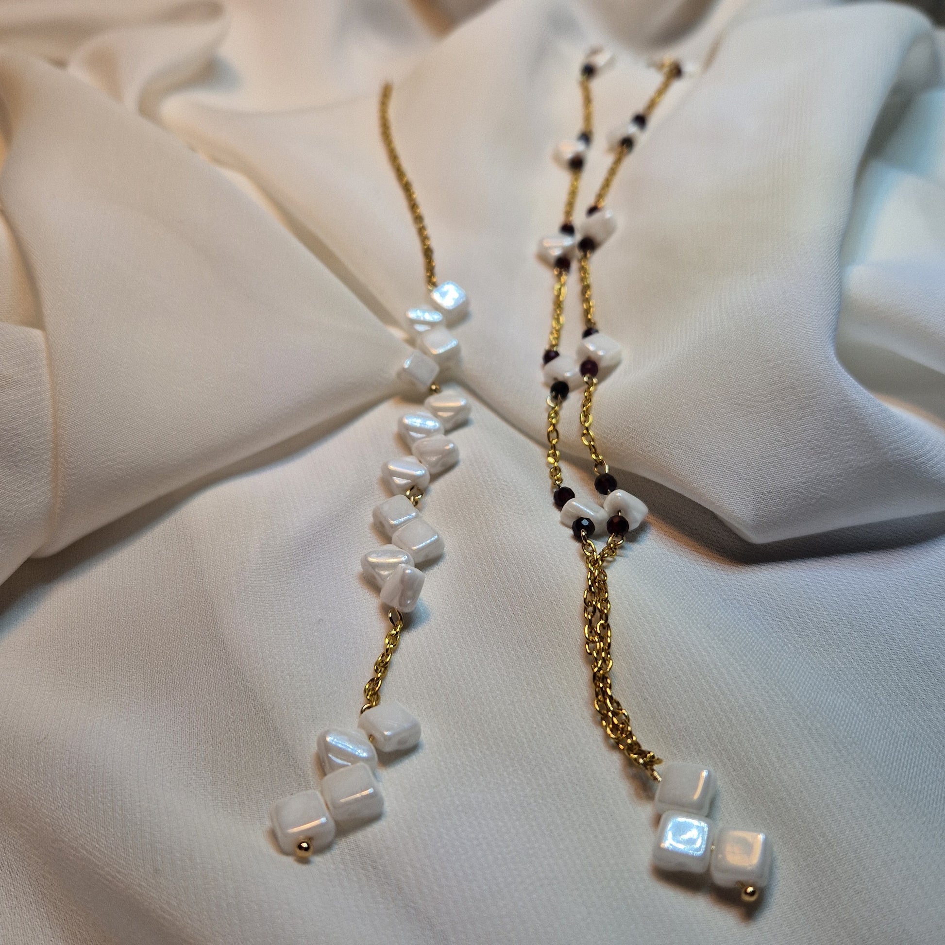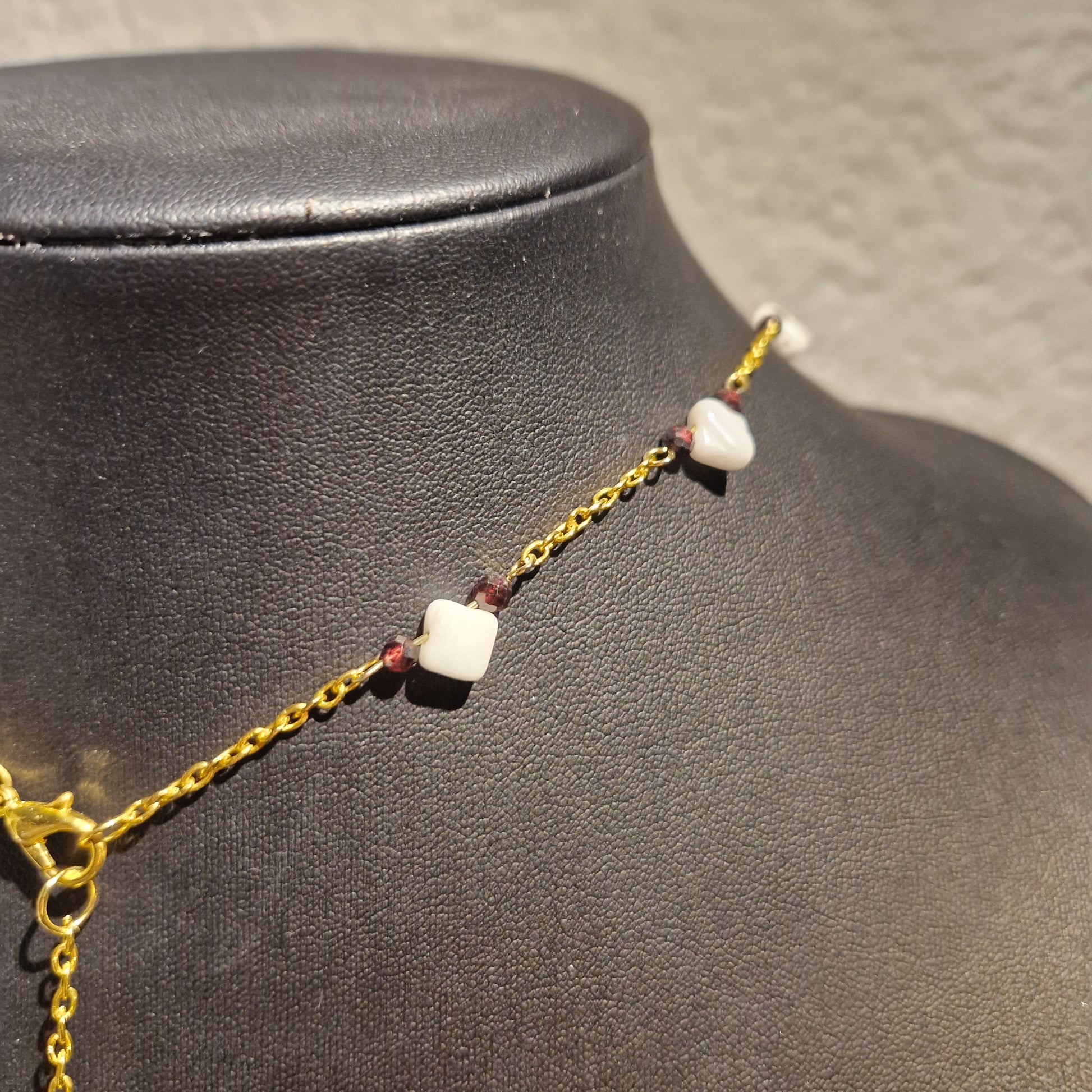 Eine wunderschöne Kette für einen besonderen Anlass. Weiße Perlmuttperlen kombiniert mit feinen Granat-Edelsteinen verleihen diesem Schmuckstück eine elegante und zugleich ausdrucksstarke Ausstrahlung. Gefertigt an einer hochwertigen Edelstahlkette überzeugt das Design durch seine zeitlose Optik.